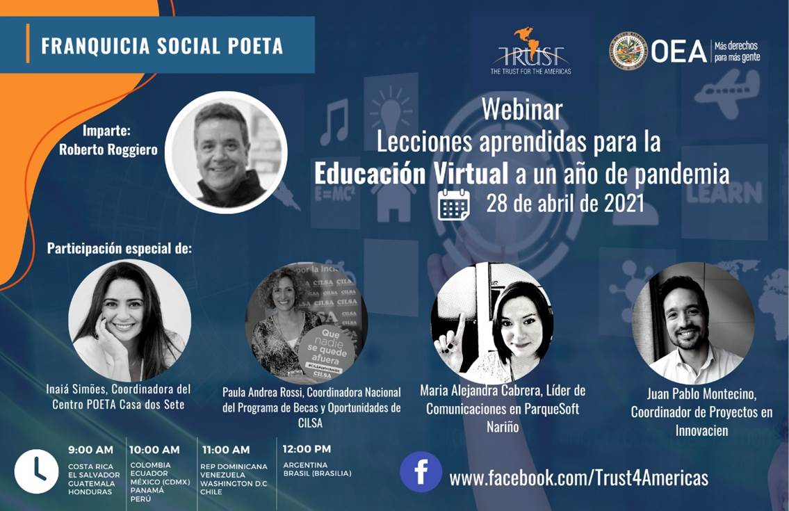 Están cordialmente invitados/as a participar de esta importante charla en la que conoceremos interesantes experiencias de adaptación educativa y tecnológica con el acompañamiento de Roberto Roggiero y con la voz de nuestros socios: Inaiá Simões - Casa dos Sete (Brasil), Paula Andrea Rossi -CILSA (Argentina), María Alejandra Cabrera - Parquesoft Nariño (Colombia), Juan Pablo Montecino - Innovacien (Chile).