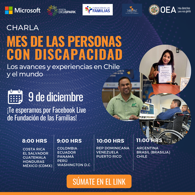 ⚡ #Trust4Americas, a través del Proyecto #POETA #DigiSpark, en alianza con Fundación de las Familias, Socio Local en Chile, te invitan a la charla: Mes de las Personas con Discapacidad “Los avances y experiencias en Chile y el Mundo”. Contaremos con la participación de grandes expositores especialistas en temas de inclusión.