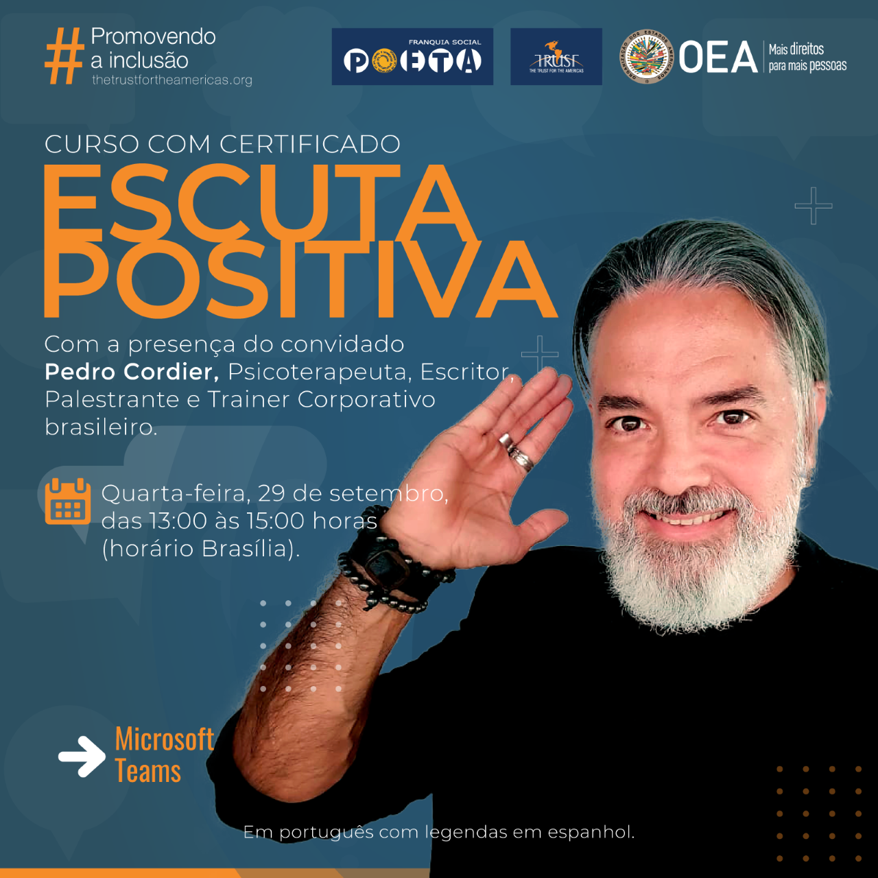 Nuestro próximo evento será un curso online, gratuito y totalmente interactivo: Escucha Positiva, con la presencia del invitado Pedro Cordier, Psicoterapeuta, Escritor, Conferencista y Formador Corporativo Brasileño.