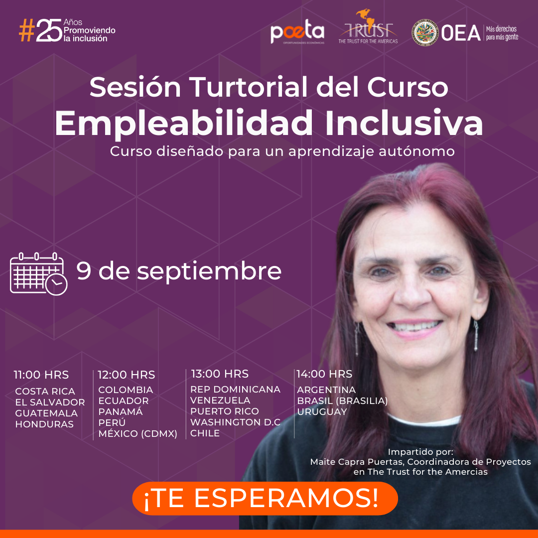 La Franquicia Social Poeta invita a su comunidad y público en general a las sesiones tutoriales de los cursos: Mi Perfil Profesional en LinkedIn y Empleabilidad Inclusiva. Todavía estás a tiempo de registrarte en estos interesantes cursos vinculados con el mundo laboral, son abiertos, gratuitos y están disponibles en nuestras plataformas: Aula Virtual TRUST<https://aulavirtual.trustfortheamericas.org/> y Capacítate<https://capacitate.trust-oea.org/>