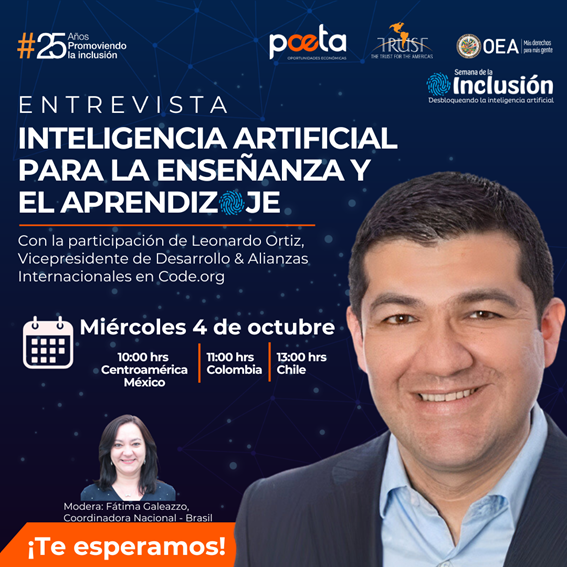 ¡Únete a nosotros en "IA para la Enseñanza y el Aprendizaje"! con el experto Leo Ortiz de Code.org. En el marco de la 3ra edición de la Semana de la Inclusión Trust: Inteligencia Artificial para Todos, acompáñanos el próximo miércoles 4 de octubre a las 10 hrs de México a través de Teams de manera virtual. Descubre cómo la Inteligencia Artificial está transformando la forma en que enseñamos y aprendemos.